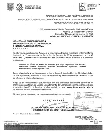 Milpa Alta aseguró en las respuestas vía transparencia que no tiene registros autorizados de hoteles y moteles, respectivamente, debido a que el uso de suelo no permite su actividad. En otra solicitud, Magdalena Contreras dijo no tener registro alguno de moteles.