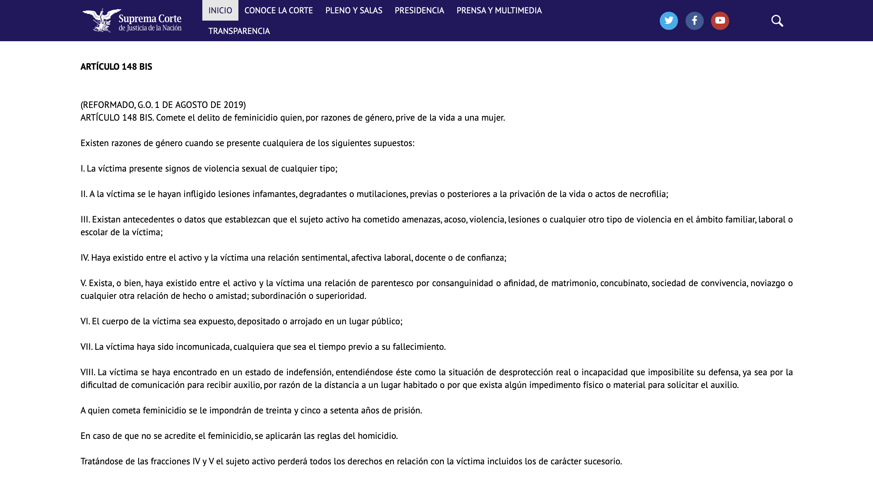 En todos los casos está presente al menos una de las siete causales para que sean clasificados como feminicidio a nivel federal o de las ocho que contempla la Ciudad de México tras la reforma más reciente realizada el 1 de agosto de 2019. Éstas consisten en que las víctimas tengan signos de violencia sexual; presenten lesiones o mutilaciones; que hayan existido amenazas o acoso; que con el agresor hayan establecido una relación sentimental, laboral, docente; que hubiera existido un vínculo de parentesco; que las mujeres hayan sido incomunicadas; o que ellas se encontraran en estado de indefensión.