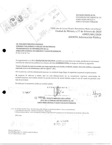 Milpa Alta aseguró en las respuestas vía transparencia que no tiene registros autorizados de hoteles y moteles, respectivamente, debido a que el uso de suelo no permite su actividad. En otra solicitud, Magdalena Contreras dijo no tener registro alguno de moteles.